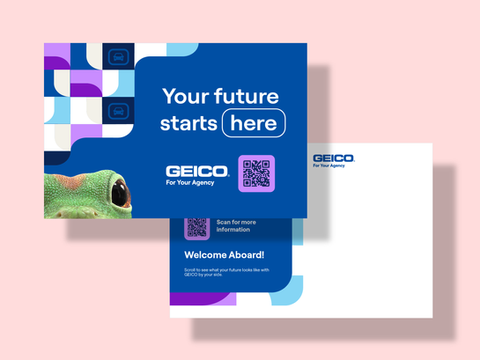 To help GEICO's independent agent channel stand out from our consumer-facing creative, I partnered with our creative agency, The Martin Agency, to create a distinct visual identity system – including brand guidelines and custom-made patterns and other graphic elements. This gave these agents a more tailored, ownable B2B design language while still feeling connected to the larger brand.